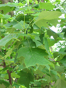 | これはユリノキの葉。花はチューリップのような形ですが、葉は奴(やっこ)が着る半纏(はんてん)の形。別名のハンテンボクは葉の形からつけられたそうです。 |