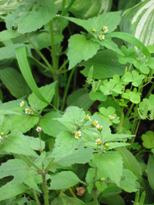 | この雑草の名前はハキダメギク。いつもたくさんの植物の名前を教えていただくのに、なぜか変わった名前のものばかりを覚えてしまいます。アフリカ原産で、かの牧野富太郎先生が東京の掃きだめ(ごみ捨て場)で初めてこの帰化植物を発見されたため、この名前をつけられたそうです。 |