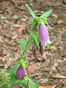 ヤマホタルブクロの花。ホタルブクロとの違いは、ガクの間についている付属体が反り返っているのがヤマホタルブクロ。反り返らずに膨らんでいるだけのがホタルブクロだそうです。 |