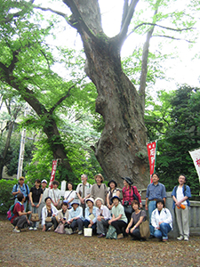| 近くにある青渭神社のケヤキの巨木も見学しました。幹周り5.5m、樹高34m。樹齢は数100年。 |
