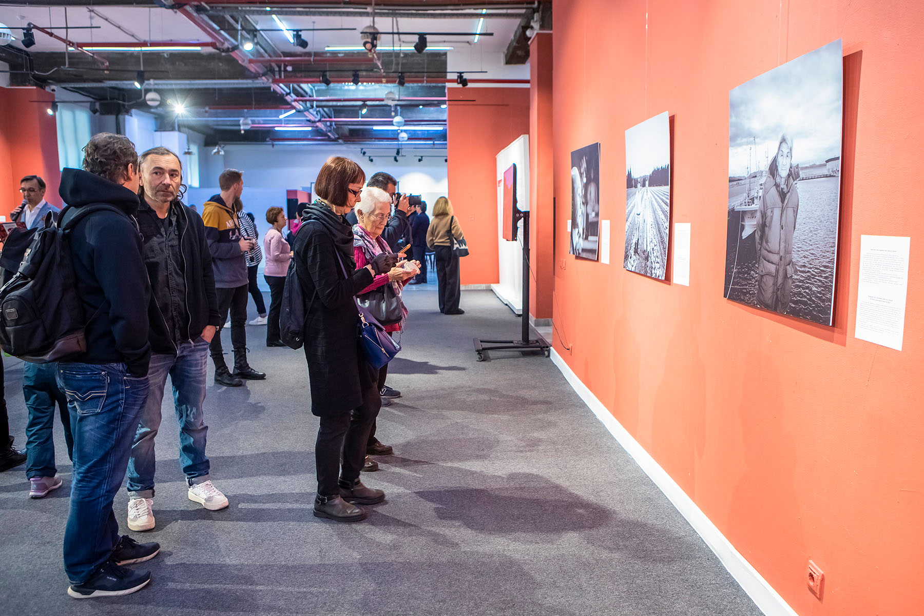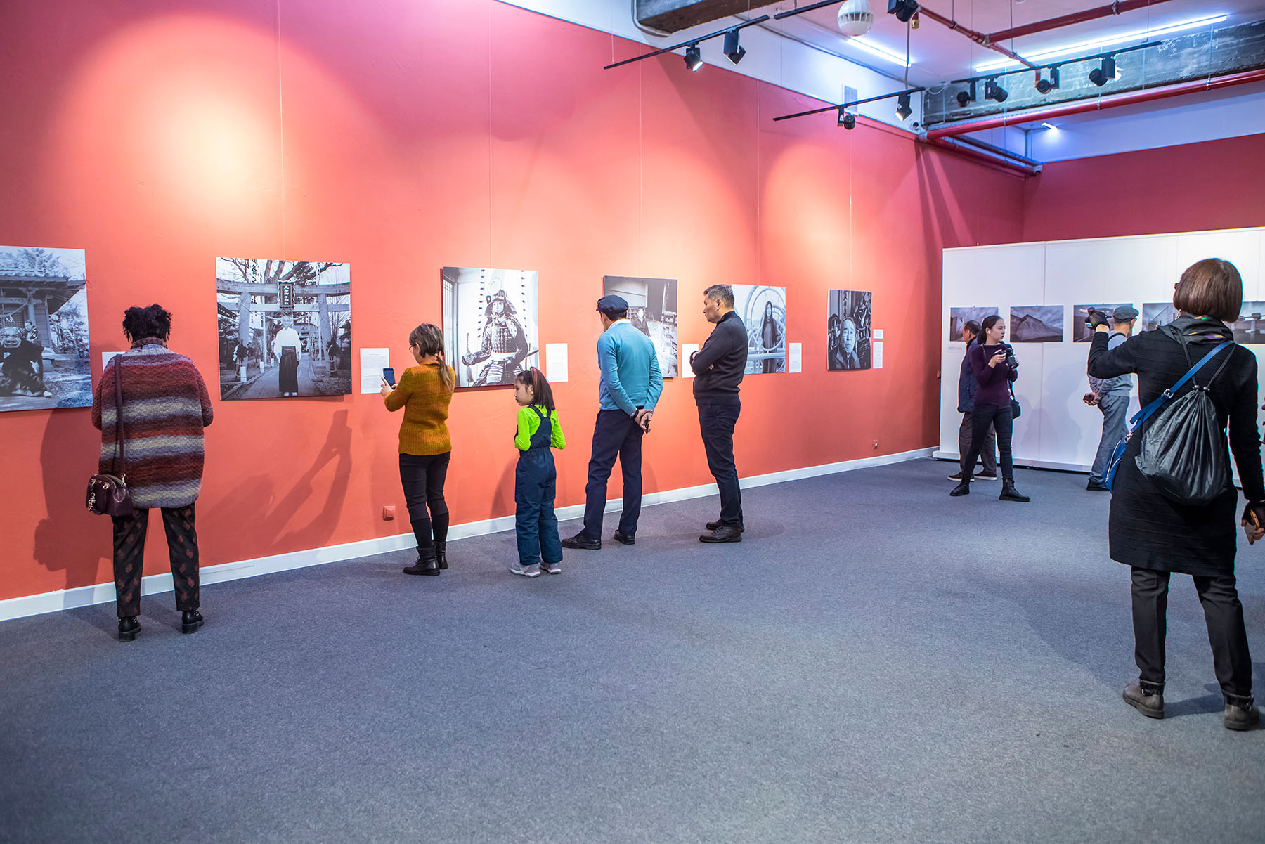 アルマトイ・ギャラリーには16時のオープニング・ セレモニーの前からたくさんの人が訪れていました。震災後にできた防潮堤や海の風景、福島の人々 のポートレートを熱心に見てくださっていました。