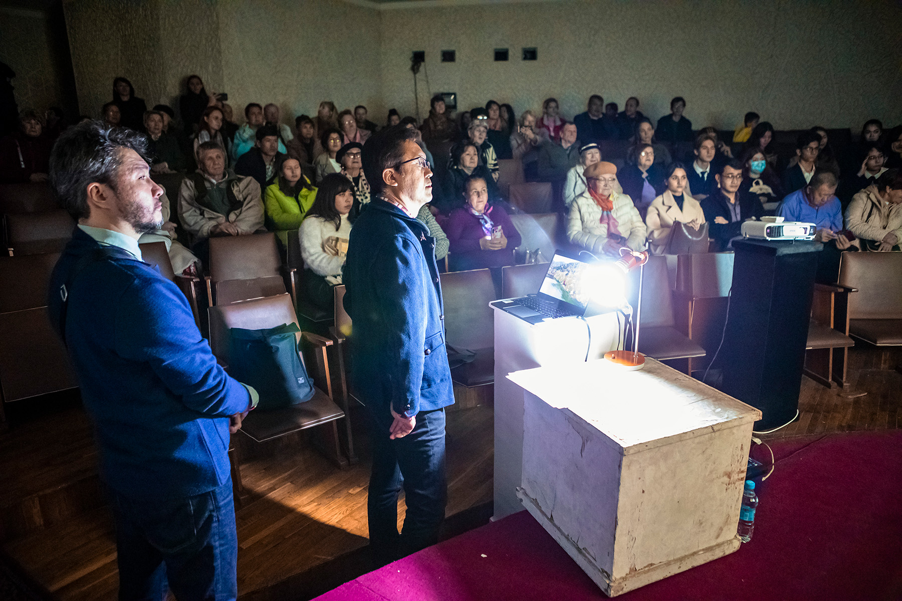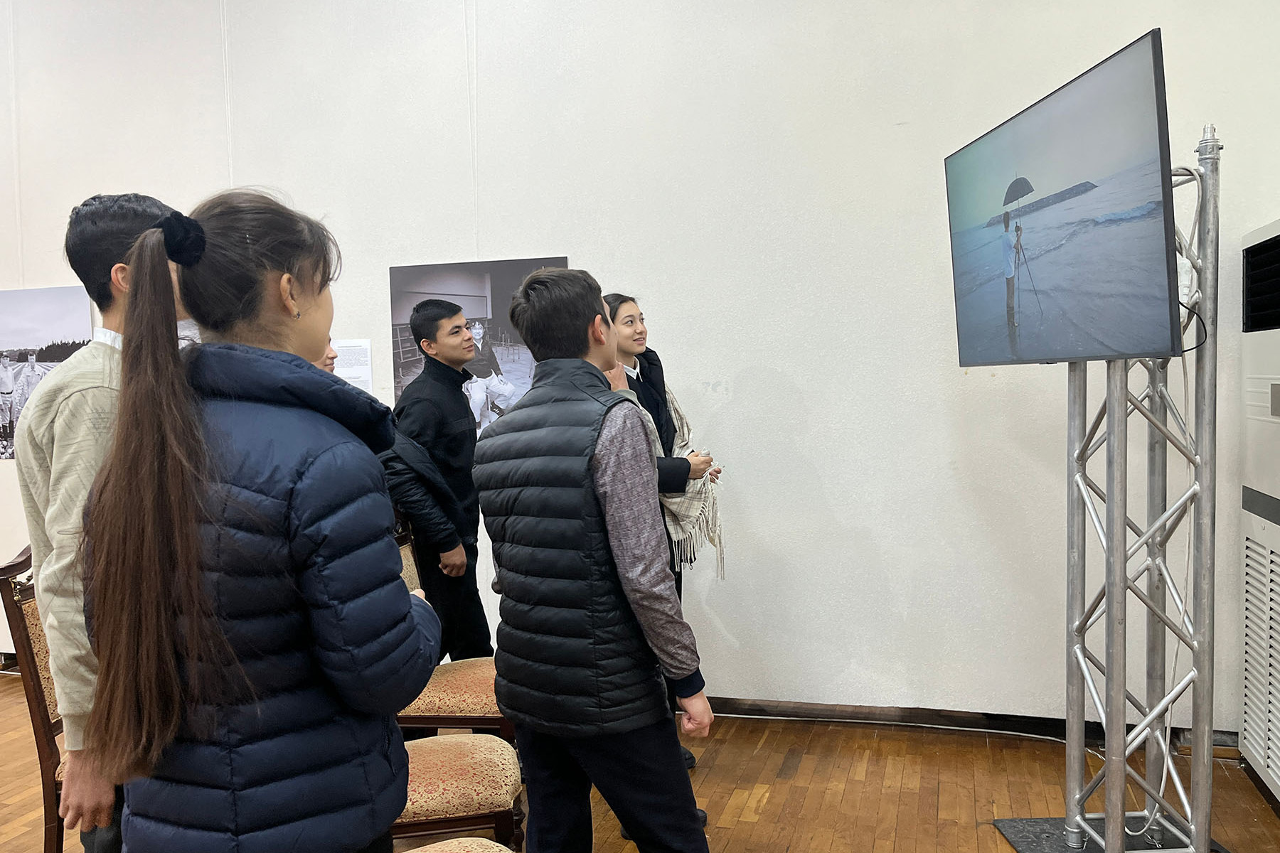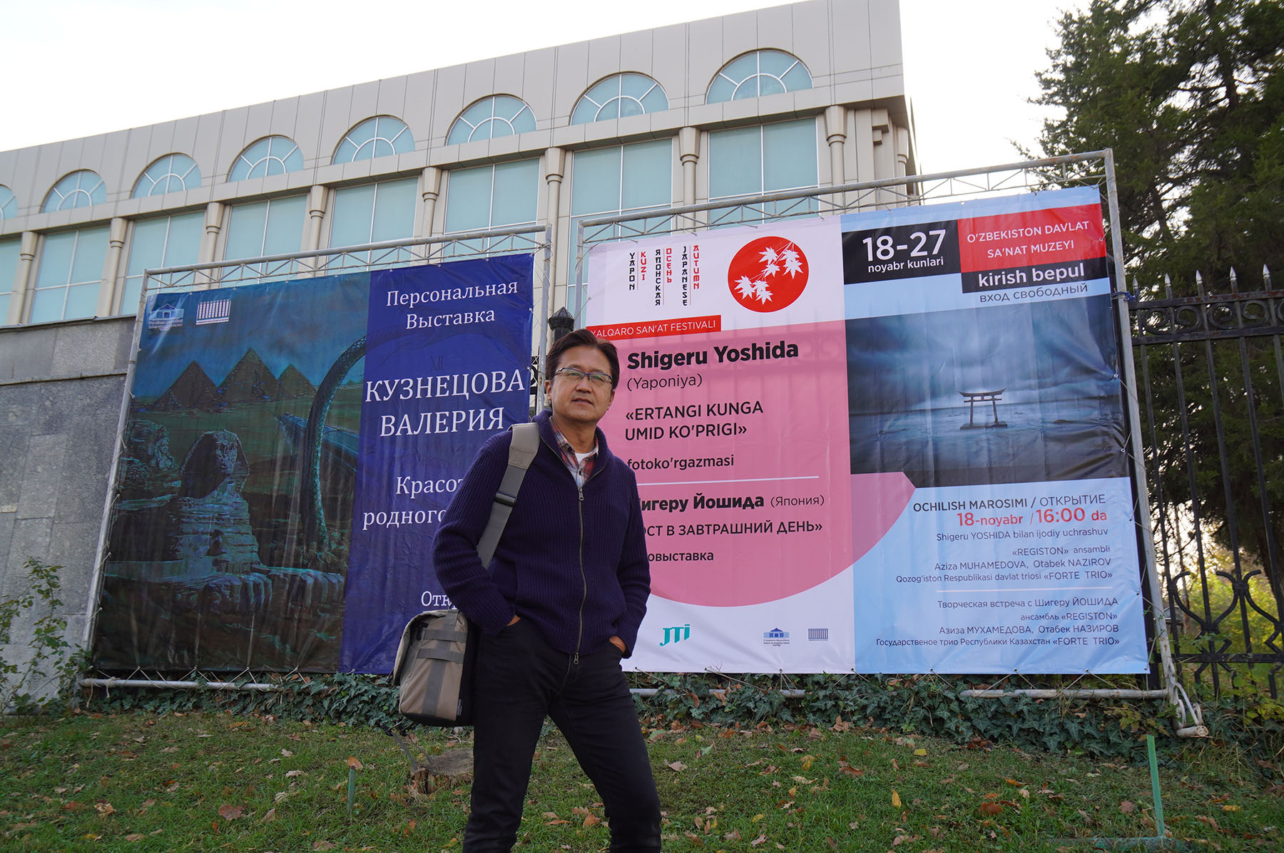ウズベキスタン国立美術館は1918年に設立され、1935年まではロシア帝 国皇帝のニコライのロマノフ宮殿内に、1966年までは人民広場にあり、 1974年にこの地に新設されました。世界各国の美術品約50,000点を展示 しています。格式ある国立美術館で開催された「日本の秋2022」イベント に蟹江さんと吉田先生は招待作家として招かれました。 蟹江さんはドキュメンタリー映画『福島からのメッセージ』の上映と講演 会、吉田繁先生は60点の写真作品が展示される個展と講演会を行いました。