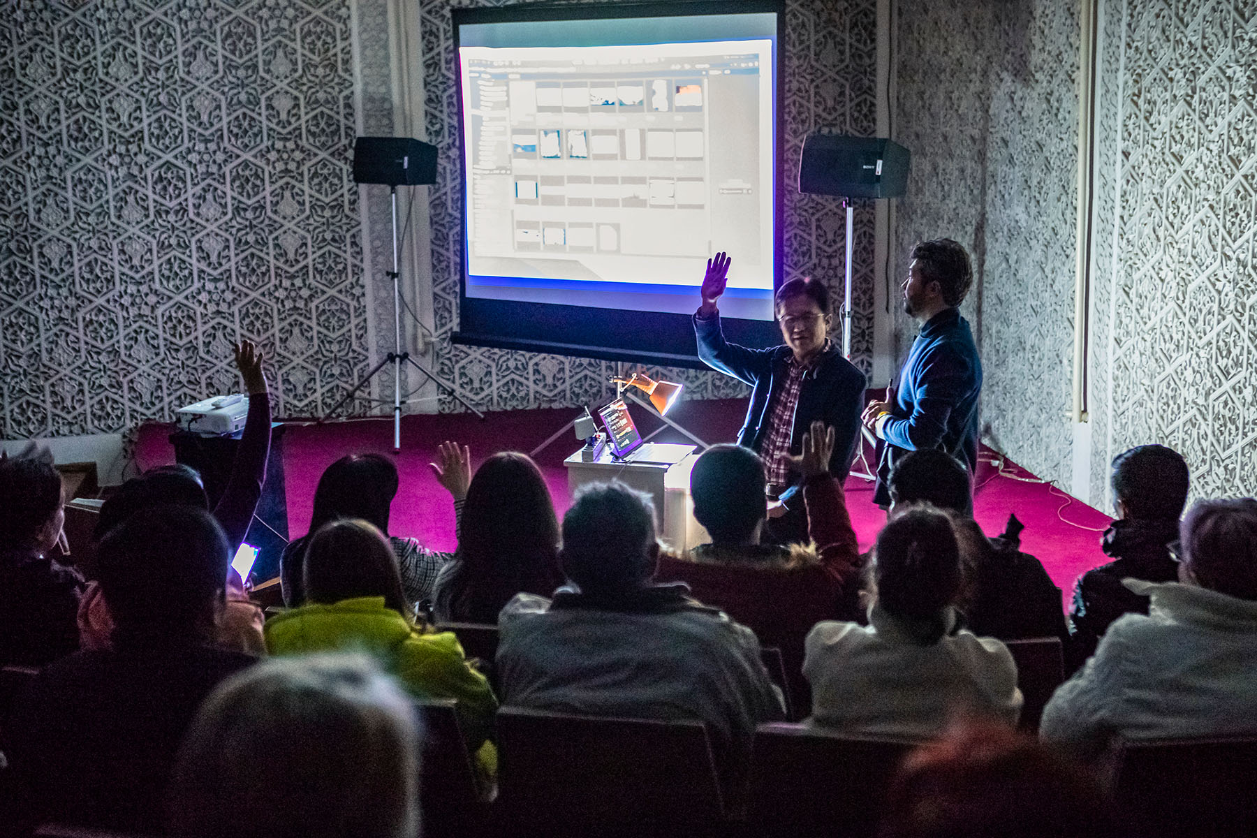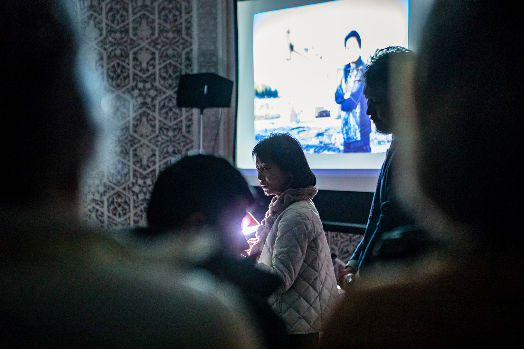 蟹江さんのドキュメンタリー映画を見る人々と講演会の様子
