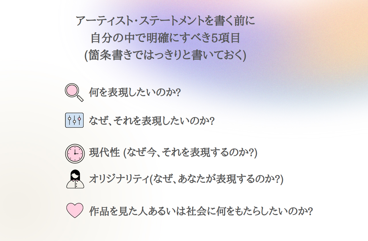 内容は①アーティスト・ステートメントとは ②ステートメントを教えたいと思ったきっかけ ③書くとどんな効果があるか ④書くための手順 ⑤文章化のポイントなど。