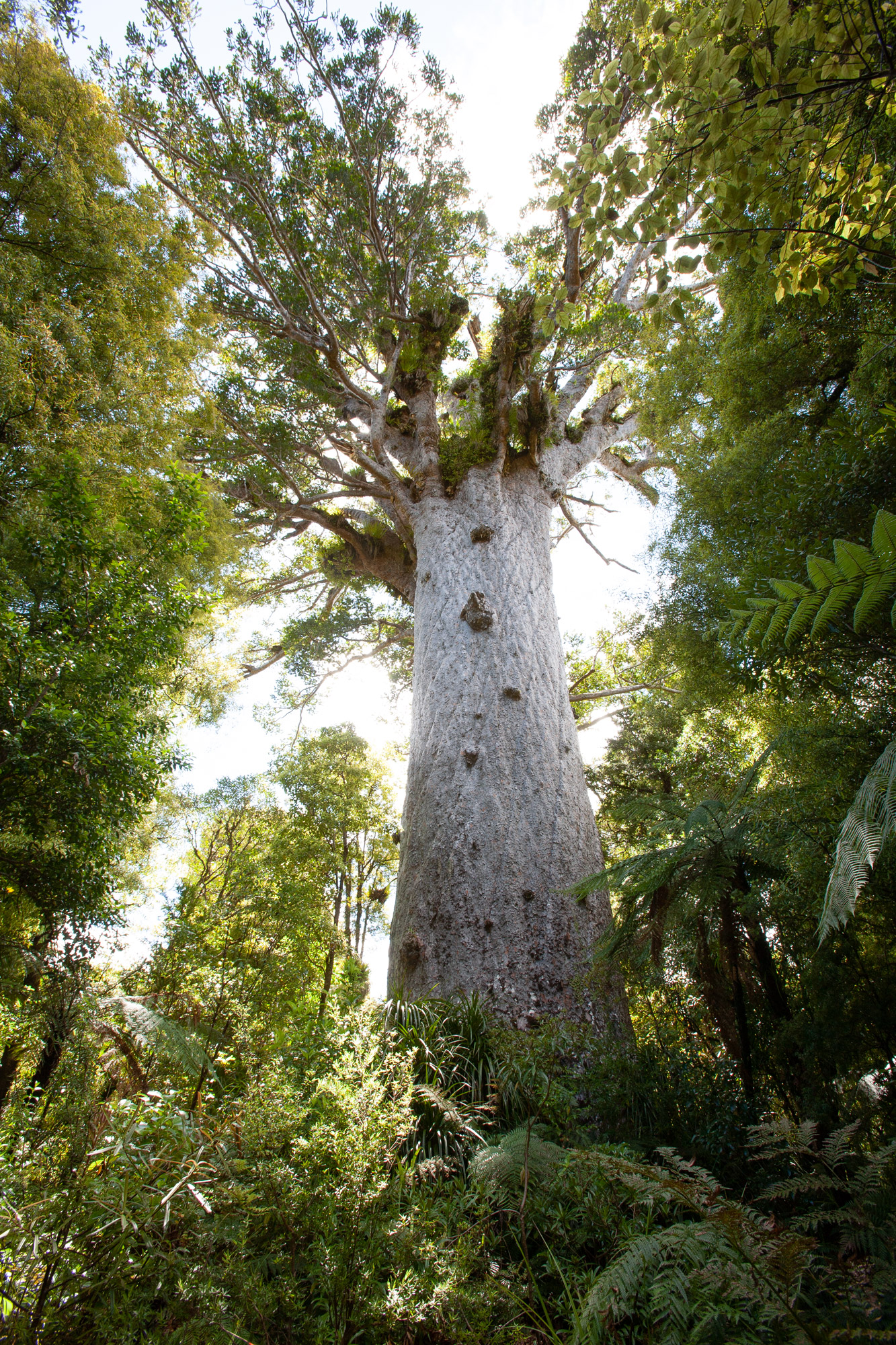 「タネ・マフタ(森の神)」は樹高51.5メートル、幹回り13.8メートル、推定樹齢2000年以上。ニュージーランドで最も太いカウリは「テ・マツアナヘレ(森の父)」で幹回り16.41メートル。これもワイポウアの森にある