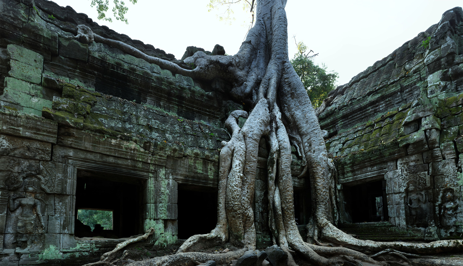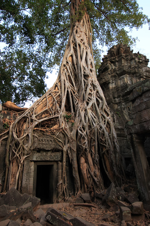回廊の屋根から縦横に根を下ろして、いまにも崩れ落ちそうな石積みの遺跡をのみ込むかのような勢いで伸びる巨木。それは栄華を誇った人間の営みなど歴史の1ページを飾ったにすぎず、結局はすべて自然に帰すのだと無言で語っているかのようだ。